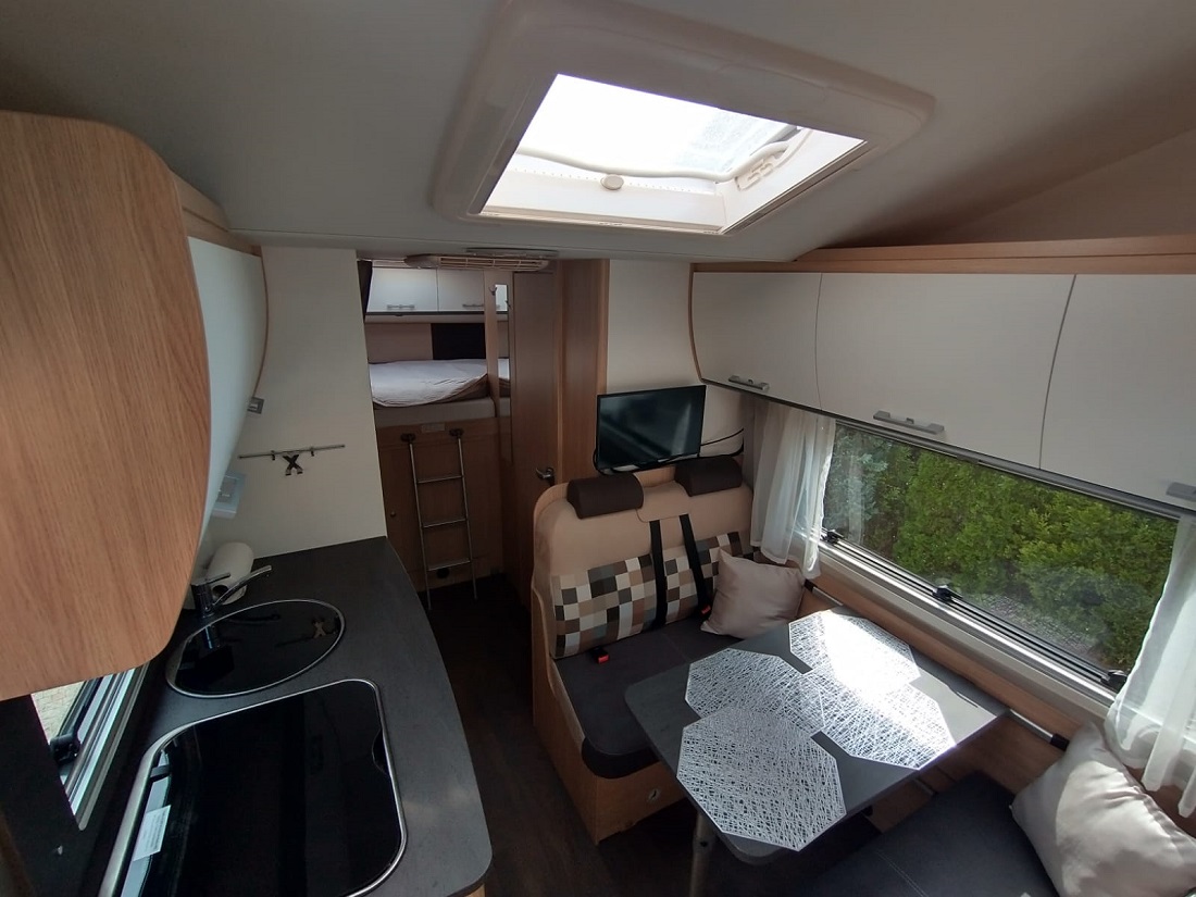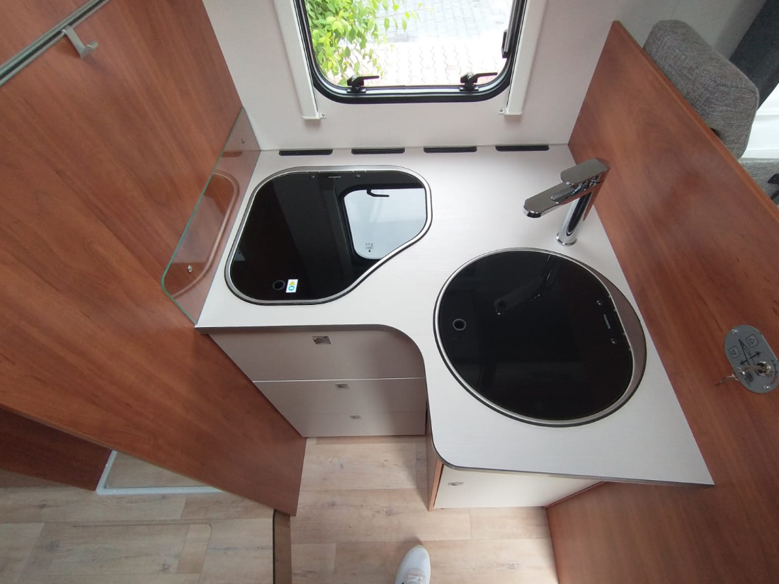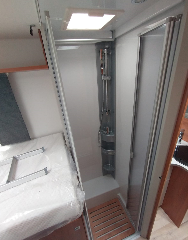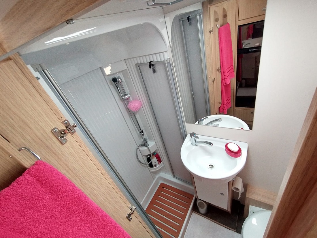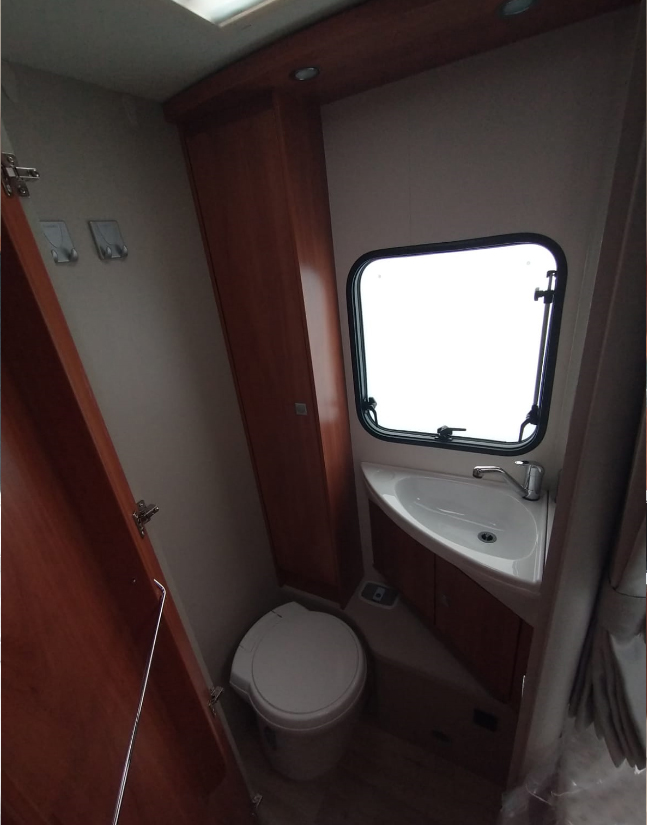Kamper posiada wc, umywalkę, kabinę prysznicową, lusto, szafki, gniazdo prądowe. Płyn do toalety, wąż do wody w zestawie.